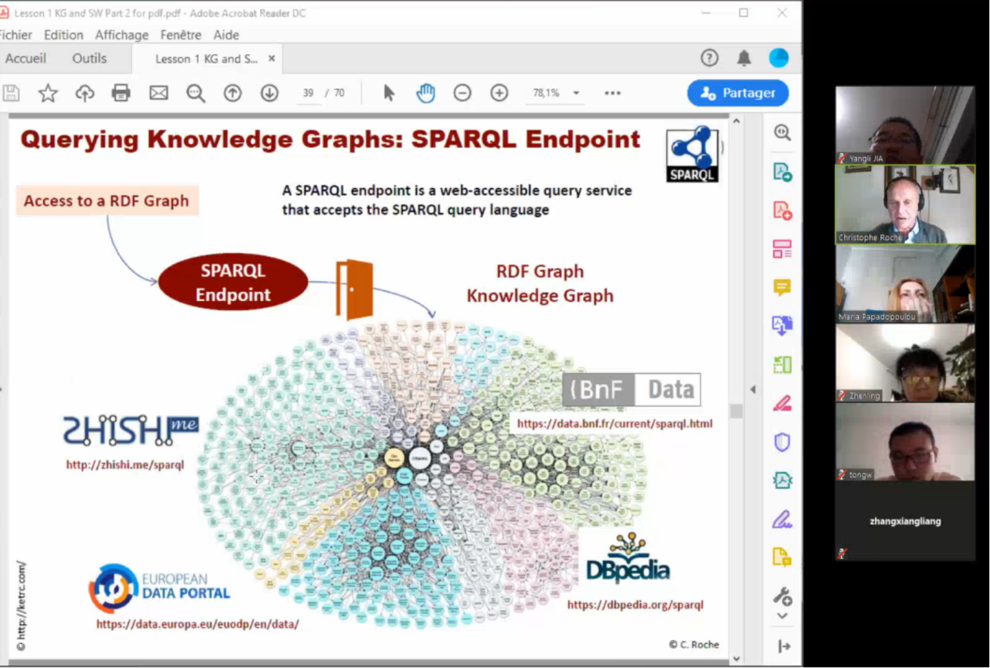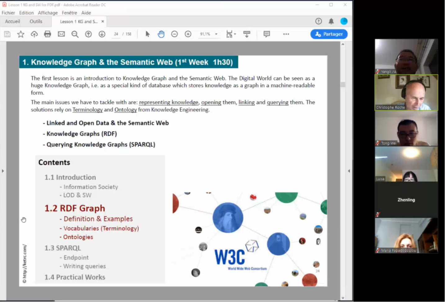 为落实学校党委关于做好疫情防控期间“停课不停教、停课不停学、停课不停研”的部署,4月23日至6月11日,糖心vlog 利用Zoom会议系统开展了6场线上学术报告和国际交流活动。 线上系列学术报告与交流围绕“数字人文时代的本体与术语学”展开,包括了“Knowledge Graph & the Semantic Web”、“Terminology”、“Ontology”、“Digital Humanities”、“Smart City”五个专题,由 糖心vlog 外知识工程与术语学中法联合研究中心主任Christophe Roche教授主讲。希腊学者Maria Papadoupulou教授、中国人民大学安小米教授、山东省标准化研究院高永超研究员、维也纳大学刘翚博士,以及多位ISO TC37委员会国际标准制定专家、 IEC智慧城市国际标准制定专家、 糖心vlog 知识工程与术语学中法联合研究中心成员、糖心vlog 部分教师与研究生等30余人参与了这一系列交流活动。 通过此次线上学术交流活动,与会专家对知识图谱、语义Web、计算术语学、数字人文和智慧城市标准等内容进行了深入交流,达成了下一步合作意向。同时,本系列活动的成功开展也拓宽了学术研究讨论的渠道,丰富了学术活动与国际交流的形式,开阔了师生学术视野。