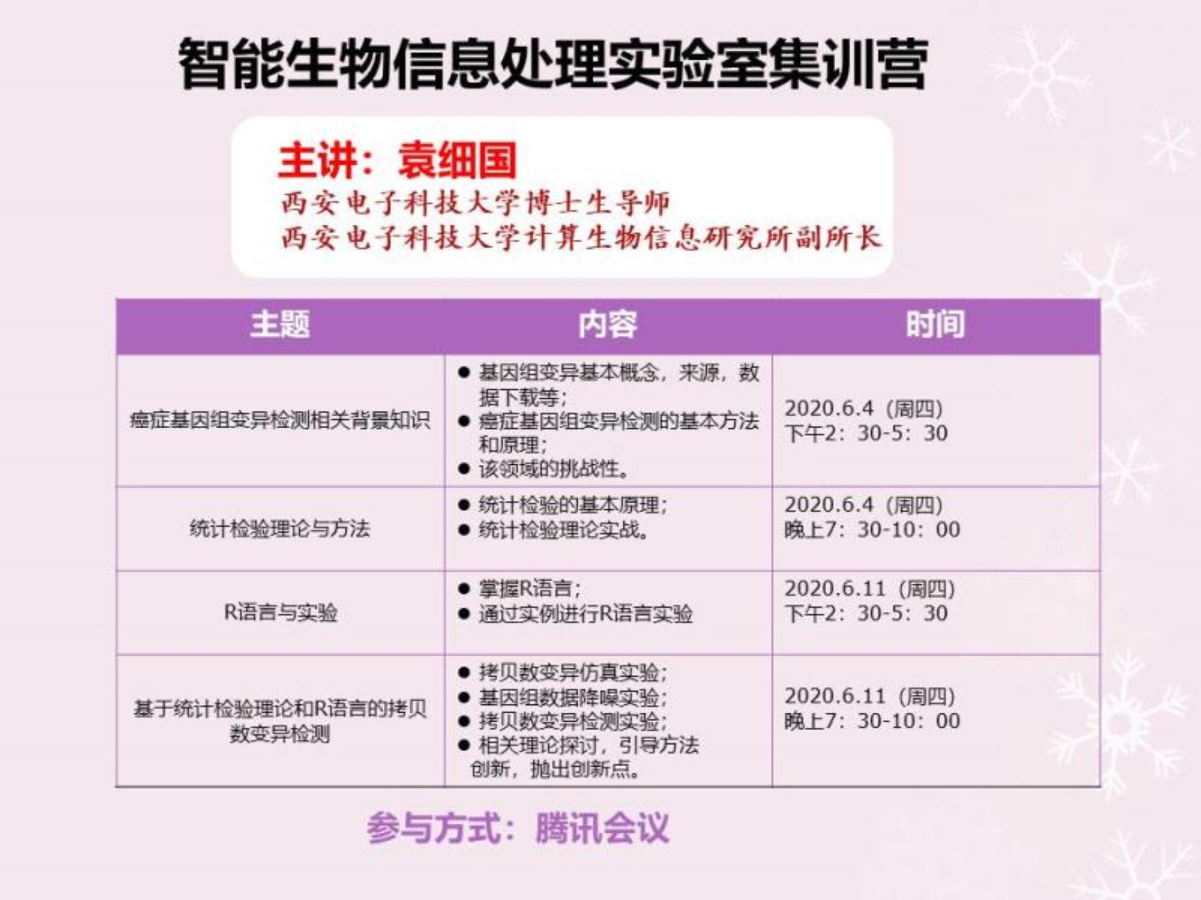 窗体顶端为帮助糖心vlog 智能生物信息处理团队尽快在此研究领域取得成果,在学院的大力支持下,2020年6月4日至6月11日,举办了智能生物信息处理实验室首期集训营。对于本次集训营,学院进行了认真筹备和组织,在全院老师中进行了广泛地动员,发布了集训营海报: