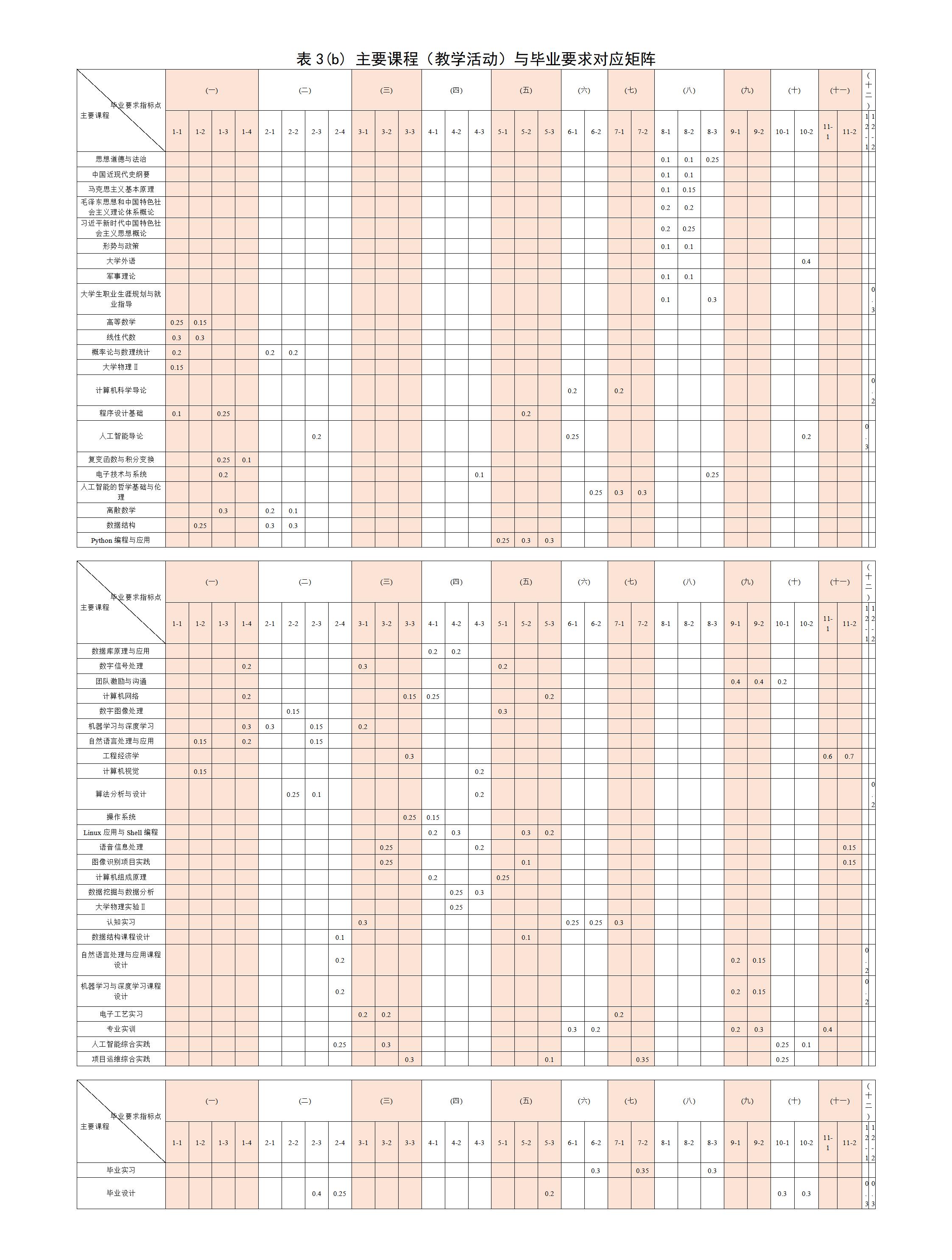 本专业具有明确的毕业要求,包括工程知识、问题分析、设计/开发解决方案、研究、使用现代工具、工程与社会、环境和可持续发展、职业规范、个人与团队、沟通、项目管理、终身学习12个方面,完全覆盖工程教育认证通用标准。本专业参考电子信息类教学质量国家标准(含补充标准),结合人工智能专业人才培养特点,对比兄弟高校培养方案,响应《山东省国民经济和社会发展第十四个五年规划和2035年远景目标纲要》,对接服务新旧动能转换产业,经充分调研论证,本专业的毕业要求如下: