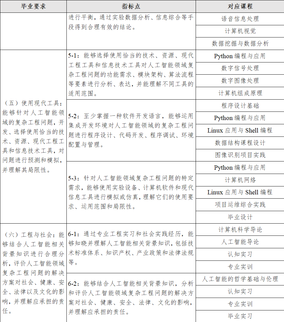 本专业具有明确的毕业要求,包括工程知识、问题分析、设计/开发解决方案、研究、使用现代工具、工程与社会、环境和可持续发展、职业规范、个人与团队、沟通、项目管理、终身学习12个方面,完全覆盖工程教育认证通用标准。本专业参考电子信息类教学质量国家标准(含补充标准),结合人工智能专业人才培养特点,对比兄弟高校培养方案,响应《山东省国民经济和社会发展第十四个五年规划和2035年远景目标纲要》,对接服务新旧动能转换产业,经充分调研论证,本专业的毕业要求如下:
