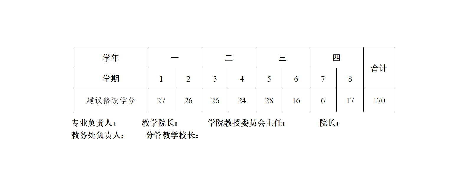 本专业标准学制为四年,学校实行学分制下的弹性学制。计划总学时为2552学时,总学分为170学分。允许学生在3~8内修完规定课程,修满规定学分,准予毕业。符合学位授予条件者,经校学位委员会审核通过,授予工学学士学位。