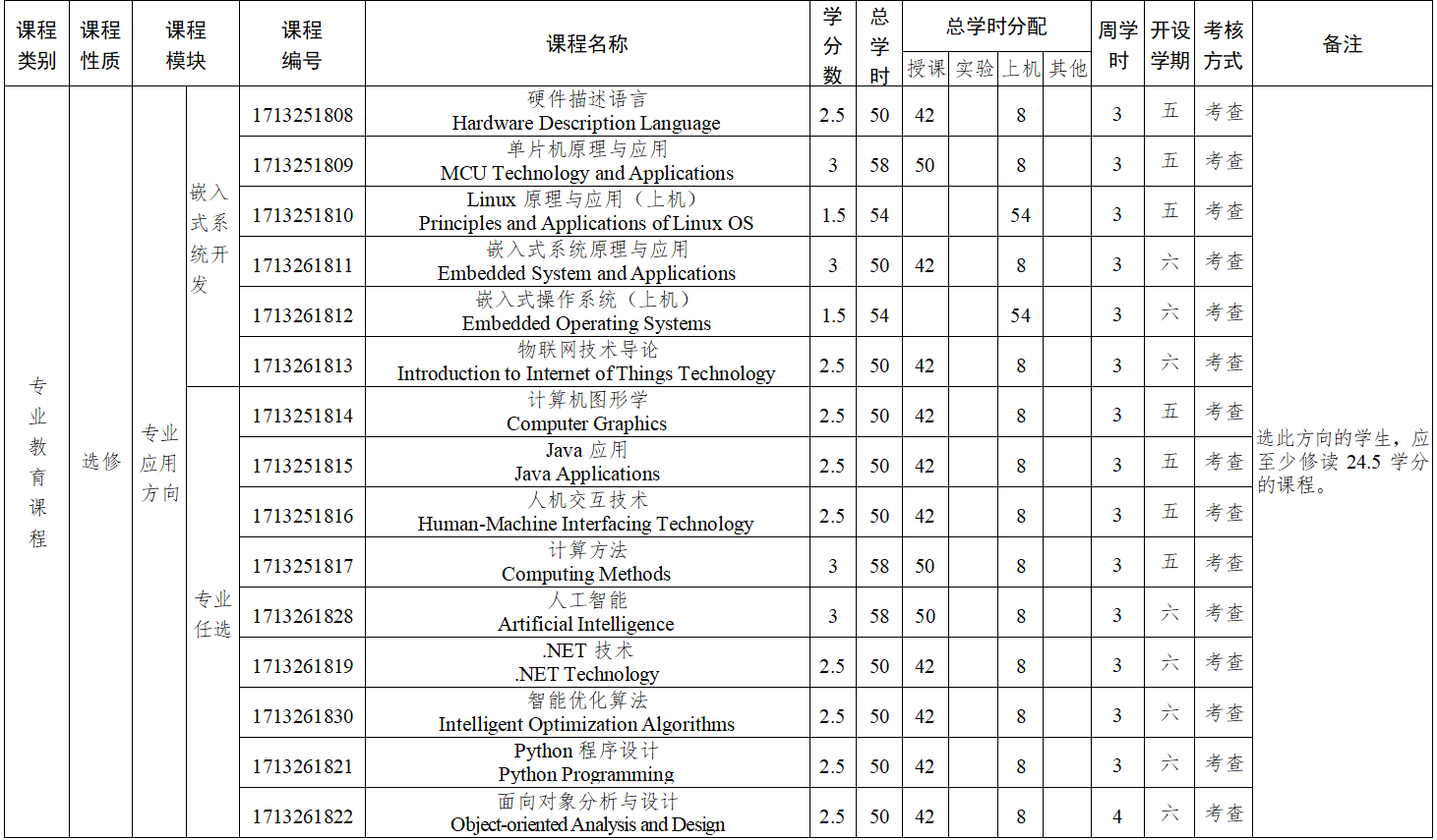 主要课程:高等数学、线性代数、概率论与数理统计、计算机科学导论、程序设计基础、数字逻辑、面向对象程序设计、电子技术基础、计算机组成原理、数据结构、Java 与面向对象技术、微机原理与接口技术、操作系统、离散数学、数据库原理与应用、计算机网络、软件工程、算法分析与设计、编译原理等。