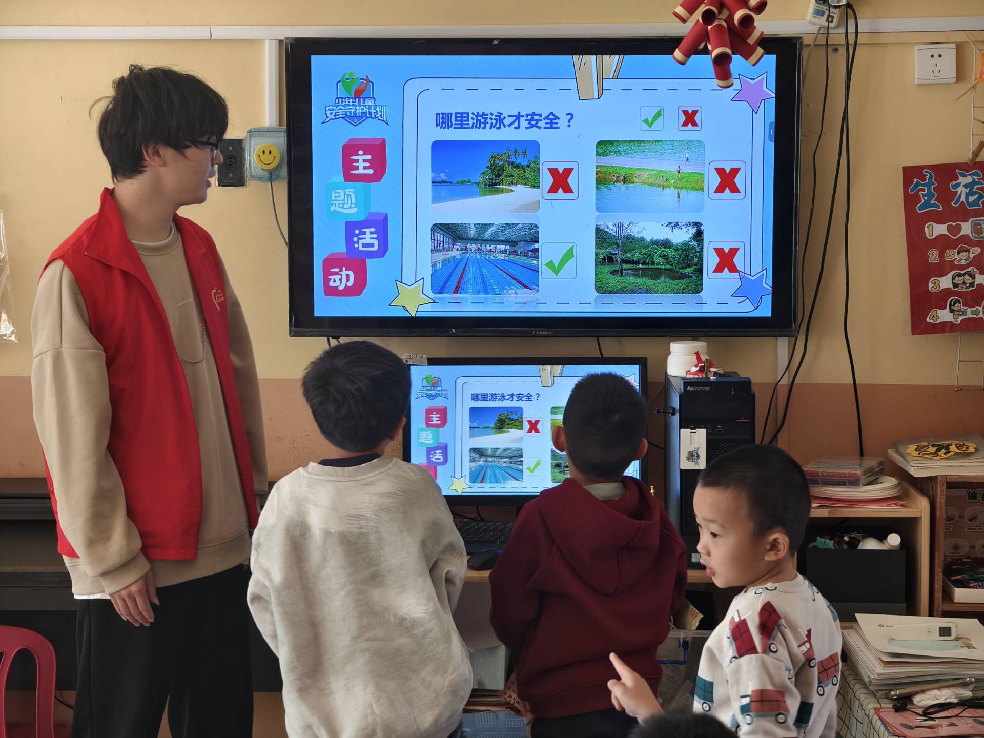 活动前期,E青志愿者协会通过线上培训的方式,进行了全面而充分地准备工作,以确保志愿者们能够深入理解和掌握运动安全知识。活动当日,志愿者们被分为两个小组,分别针对大一班和大二班展开教学活动。志愿者们借助生动形象的PPT演示,并结合实际发生的案例,向孩子们详细阐述了运动安全的重要性。随后,他们通过播放精练的动画视频以及展示正确规范的运动动作,围绕安全游泳、运动损伤的预防以及紧急处理这三个方面,为儿童全面普及了运动安全知识。在整个活动过程中,孩子们展现出了浓厚的兴趣,他们认真思考、积极应答,踊跃参与各项互动环节,现场氛围极为活跃。