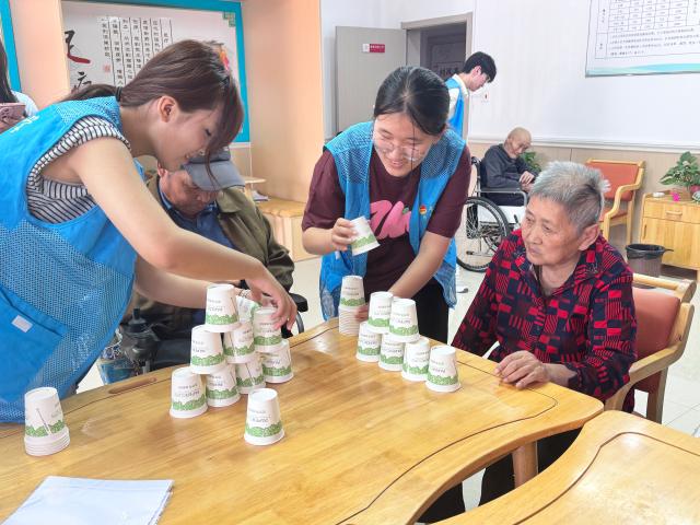 在活动开展前,志愿者们便进行了精心的策划与充分的准备,设计了多个趣味活动和小游戏,并提前与养老院负责人进行了细致沟通,保证活动顺利推进。活动当日,志愿者们先带老人们进行了折纸活动,从对折、翻转到塑形,志愿者们手把手引导老人进行制作。在志愿者的耐心指导下,一张张普通彩纸逐渐幻化成展翅欲飞的千纸鹤、娇艳绽放的纸花。随后进行的纸杯叠叠乐将现场气氛推向高潮。老人们屏气凝神地将纸杯堆叠成塔。有的老人经验丰富,动作行云流水,眨眼间便搭建起十余层的“纸杯高塔”;有的则略显生疏,双手微微颤抖,但在志愿者的加油声和同伴的协助下,也顺利完成挑战。游戏环节结束后,志愿者们与老人们围坐在一起,亲切地拉家常、谈趣事。老人们分享着自己的人生故事和生活感悟,志愿者们认真聆听、细心回应,现场氛围温馨而融洽。