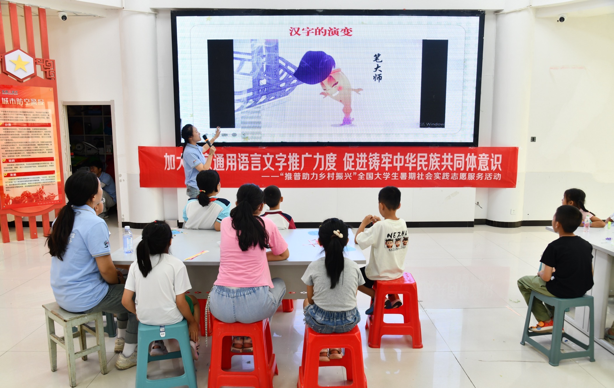 推普助力乡村振兴,青春使命砥砺前行。在此次“三下乡”社会实践活动中,“E启智普”服务队通过系统性词汇教学、双语对比训练、阶梯式闯关等多元形式,以寓教于乐的方式切实让孩子们在轻松愉快的环境中真切体会到普通话的音韵之美,更有效提升了他们的语言兴趣和开口表达的勇气。