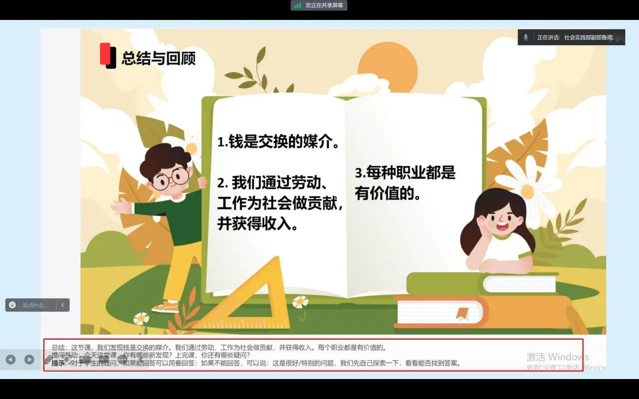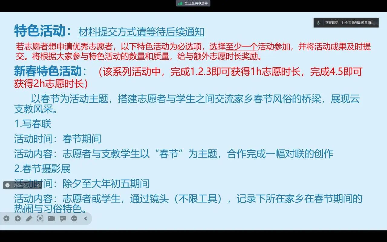 为了让志愿者们更快地熟悉活动内容和流程,鲁雨对全国大学生2024寒假“返家乡”社会实践“一起云支教”专项活动进行详细说明,主要分为活动简介和要求两方面。她通过活动的不同板块详细地介绍了志愿者的任务与职责,以及活动的实施方案与内容,并对同学们提出的相关问题答疑解惑。随后,主讲人说明了活动的要求,除对志愿者做出了基本要求以外,对学生个人信息的保密方面也做了强调,让志愿者们对活动内容和要求有了更深入的理解和认识。最后,鲁雨介绍了不同活动板块的志愿者时长占比情况,并呼吁同学们要以饱满的热情和专业的态度投入到志愿服务中,尽己所能的为社会献出一份力量。