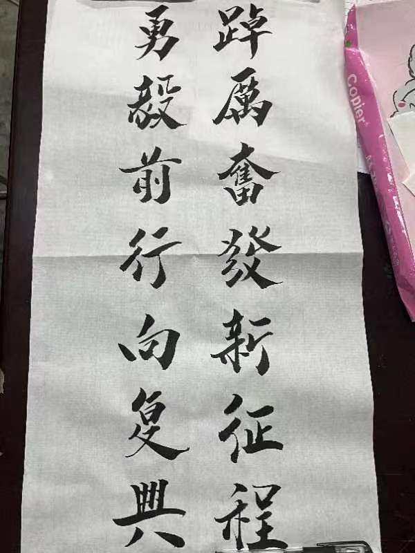 秘书处工作人员提前准备好本次活动所需要的宣纸、毛笔和砚台等工具,并对同学们的坐姿、握笔姿势、书法的书写等方面进行简单的教授,带领同学们学习汉字的书写方式,让同学们对书法有了基本认识,随后同学们进行现场实践。书写时,同学们个个满怀激情,坐姿端正,全神贯注地投入,用心书写每一笔画,在纸张尽情挥洒笔墨,划过空白的纸张,挥毫泼墨,在宣纸上尽情展现书法的独特魅力。同学们一起学习讨论书法作品,整个活动现场都沉浸在一片浓墨飘香的氛围中。活动临近尾声,同学们完成了自己的作品,横平竖直,结构匀称,整体美观,在同学们的欢声笑语中,本次活动圆满完成。