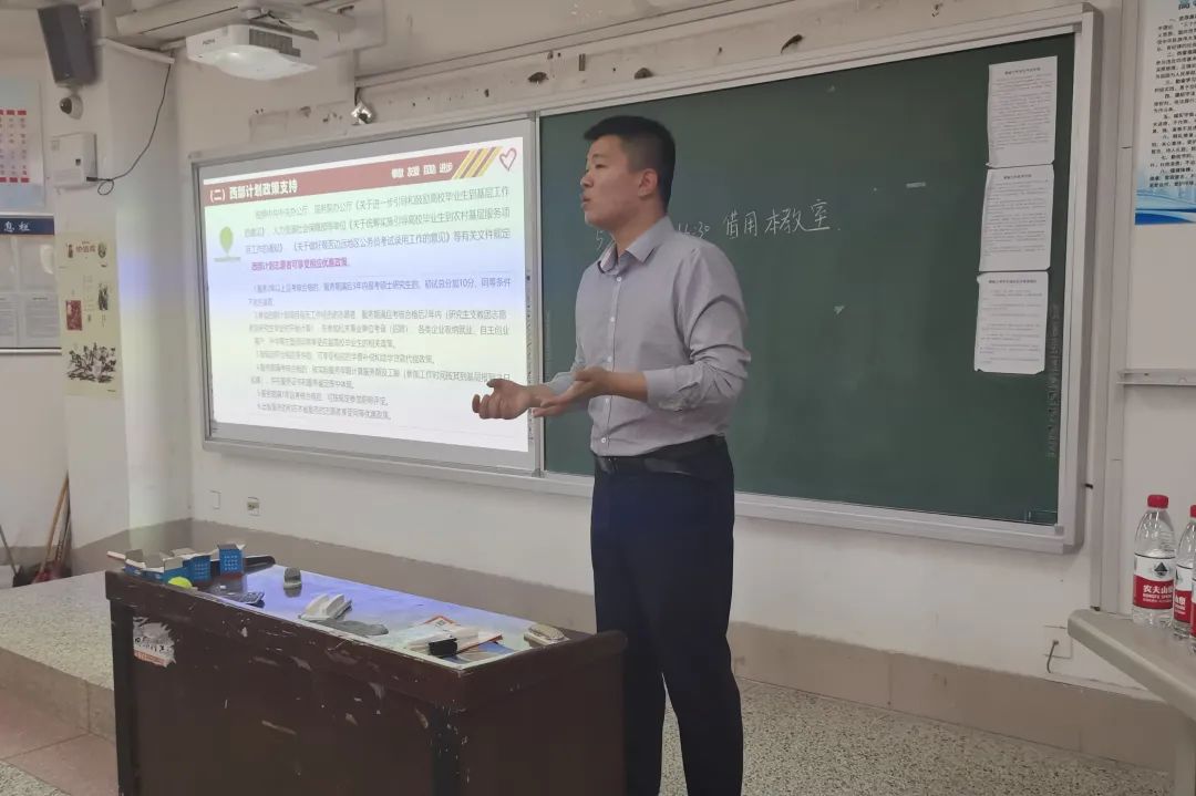 荣存福就志愿服务实施方案、志愿者日常管理办法以及经验交流等方面对西部计划进行了全面介绍和解读,他鼓励学生们以实际行动践行奉献、友爱、互助、进步的志愿精神,主动融入国家发展大局,积极投身到“西部计划”志愿服务工作中去锤炼意志品格、增长本领才干。他强调,西部计划带给大家的不仅仅是一份履历上的证明,更多地是深入西部基层生活后的成长和经历,希望大家珍惜此次机会,去感受祖国西部大地的心跳,去聆听西部人民的心跳。史秋波结合自身就业经历,以亲身感受告诫应届毕业生在选择就业岗位时切忌好高骛远,并围绕如何正确认识自己、正确认识社会、适时抓住机遇等方面引导学生做好就业前心理建设,助力应届毕业生尽快尽早就业。张雪就此次宣讲会做出总结,号召应届毕业生投身到“西部计划”志愿服务工作中,激励同学们将“爱国之志”化为“报国之行”,踔厉奋发、砥砺前行,让青春的列车向西驶去,到祖国和人民最需要的地方,争做新时代的奋进者,不断为援西计划注入新鲜力量!