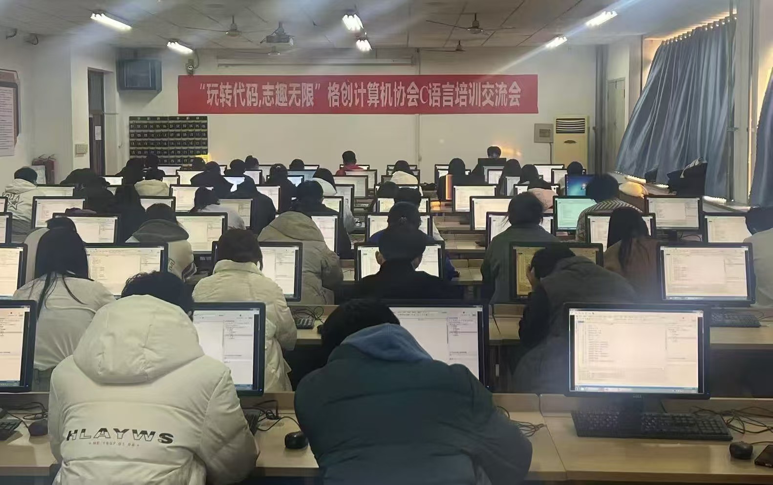 活动伊始,主讲人从C语言的基础语法开始为同学们讲解,通过生动有趣的实例,深入浅出地阐述了变量、数据类型、控制语句以及循环等核心概念,让抽象晦涩的编程知识变得具体且易于理解。主讲人通过实际操作进行演示,让知识落地,让同学们更直观地感受代码的魅力与运行逻辑。随后,同学们上机实验,将所学知识运用到实际操作中,尝试编写各种功能的代码。在此期间,同学们积极踊跃地向主讲人提出自己的疑问与独到见解。主讲人并未采取单一的指导讲解方式,而是巧妙地引导同学们深入思考,并与同学们携手共探问题的解决方案。教室里弥漫着“勤学好问、善思乐究”的浓厚氛围,整个现场洋溢着温馨和谐的融融气氛。