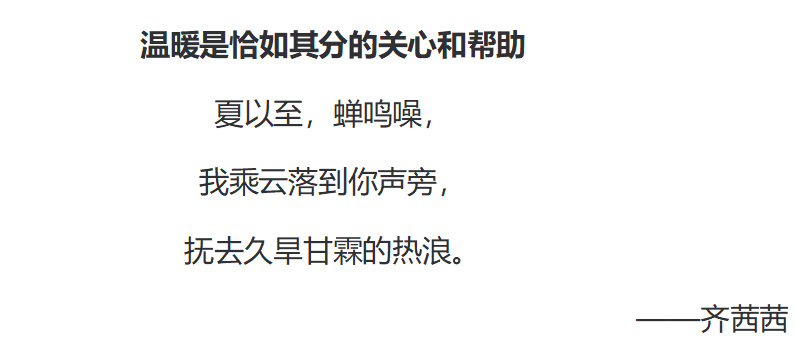 “这是我给你的温暖”三行诗评选活动提供了一次心灵交流的契机。通过诗歌的形式,我们让学生们有机会深入思考和表达对温暖的理解,倾诉内心的情感和渴望。这不仅有助于提升参与者的审美情操和文学素养,还能够增强校园内学生之间的情感联系和彼此理解。该活动增强了校园凝聚力和向心力,有利于促进师生之间更加和谐、融洽的关系,营造出积极向上、充满温情的校园氛围。