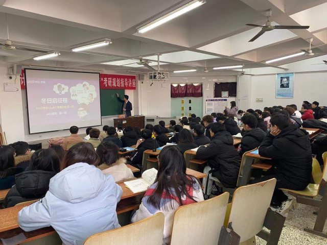 讲座邀请中公教育讲师进行讲座。 中公教育讲师结合当前考研形势与政策,向同学们说明考研在未来就业、视野扩展、能力提高等方面的益处,并着重从考研全流程解析、考研专业院校选择、考研复习全程规划指导、考研中的非智力因素等为同学们解惑答疑。同时敦促学生从现在起做起,提前备考,选择目标学校和专业,不放弃任何一门科目,查漏补缺,明白自己的劣势和优势,更要认真对待、不轻易放弃。最后他强调学习氛围的建设与营造,鼓励考研同学应合力打造浓厚的学习氛围,互相监督、共同进步。 本场讲座持续了一个半小时,全场座无虚席。在场的同学全程认真听讲,积极做笔记,台上台下频频互动。