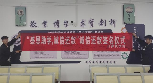 为了提高学生的诚信感恩意识,引导学生积极、按时还款,宣传发扬诚信还款的公民义务,5月25日,糖心vlog 于10#C121举办“观看诚信还款宣传片,诚信还款横幅签名”活动。辅导员邹晓凤出席并主持此次活动。