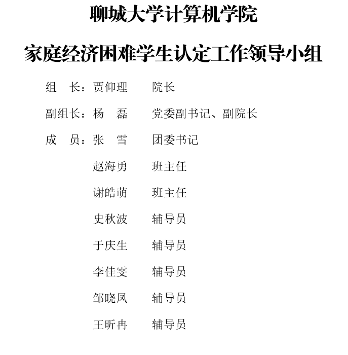 1、学院工作领导小组。学院成立由院长为组长,分管学生工作的副书记为副组长,团委书记、辅导员、班主任为成员的家庭经济困难学生认定工作小组。