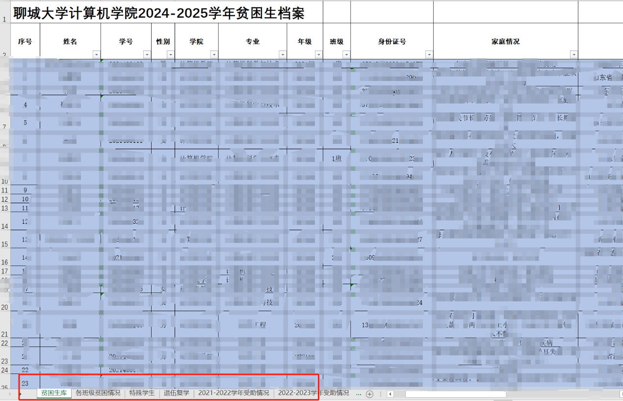 针对学院家庭经济困难学生逐一建立信息档案台账,保证一人一档。该档案涵盖个人基本信息、在校住宿信息、学生家庭经济情况(含家庭主要成员职业状况、健康状况、收入状况等)、学生本年度获资助情况、其他帮扶措施及帮扶成效等,对家庭经济困难学生实施动态管理。