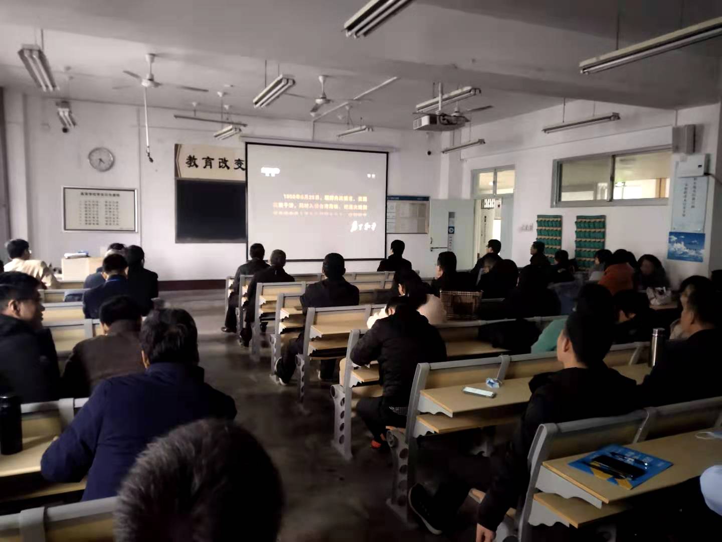康殿峰对纪录片《为了和平》的摄制背景和内容进行了简单介绍,要求全体教师认真观看学习,特别是班主任、思想政治理论课教师、辅导员作为思想政治理论教育的主力军,务必做到人人观看,人人受教育。纪录片第一集《正义担当》全面呈现了中国共产党领导抗美援朝战争的光辉历程和为了和平的正义担当,反映了抗美援朝战争的正义性质和伟大胜利,集中展示了中国人民志愿军的英雄事迹和革命精神。本纪录片采取史论结合、故事表达的方式,深入反映伟大的抗美援朝精神的丰富内涵和时代价值,生动展现全国各族人民万众一心、众志成城的精神和家国情怀。在观看过程中,全体教师重温了这段硝烟弥漫、可歌可泣的历史,回顾呈现了党领导抗美援朝战争的伟大实践,更加深刻地感受和领悟到伟大的抗美援朝精神----中国人民志愿军保家卫国、不畏强敌、舍生忘死的革命精神,也感受到自己身上所担负责任的重大,对了解历史、自觉传承伟大抗美援朝精神、提升民族自信心都有重要意义。通过组织观看纪录片,激发了大家作为高校教师和党员的使命感和责任感,大家纷纷表示,要不忘初心、牢记使命,在新的历史时期,在自己的工作岗位上继续发挥先锋模范作用,作出新的贡献,继承和发扬革命英雄的优秀品质和伟大精神,用实际行动传承理想信念的火种,紧跟时代。最后,康殿峰对此次活动进行了总结,他指出大家要把伟大抗美援朝精神作为课程思政的重要内容,有机融入课堂教学,与学生共情共鸣共振,将抗美援朝精神转化成教育报国之行。