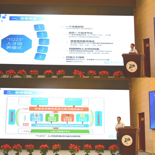 紧接着,李成友介绍了学院面向新工科开展人才培养模式改革的背景、思路和重要举措,提出了“11223”人才培养模式,即一个关键目标、依托一个技术平台、探索两种教学模式、构建两种人才评价机制、打造三个持续改进闭环,将该人才培养模式创新实践的思路做了精彩独到的分享。最后李成友将学院取得的阶段性改革成果进行了分享。