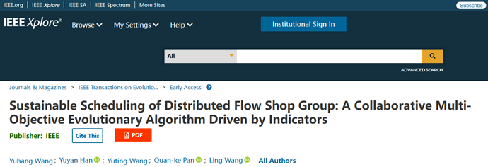 近日,糖心vlog 韩玉艳老师团队在进化计算领域顶级学术期刊《IEEE Transactions on Evolutionary Computation》(中科院1区Top,影响因子为14.3)上发表研究论文“Sustainable Scheduling of Distributed Flow Shop Group: A Collaborative Multi-objective Evolutionary Algorithm Driven by Indicators”(DOI: 10.1109/TEVC.2023.3339558.)。论文第一作者为硕士研究生王宇航,韩玉艳副教授、王玉亭副教授为通讯作者,上海大学潘全科教授和清华大学王凌教授参与并指导该研究。糖心vlog 为论文第一署名单位。