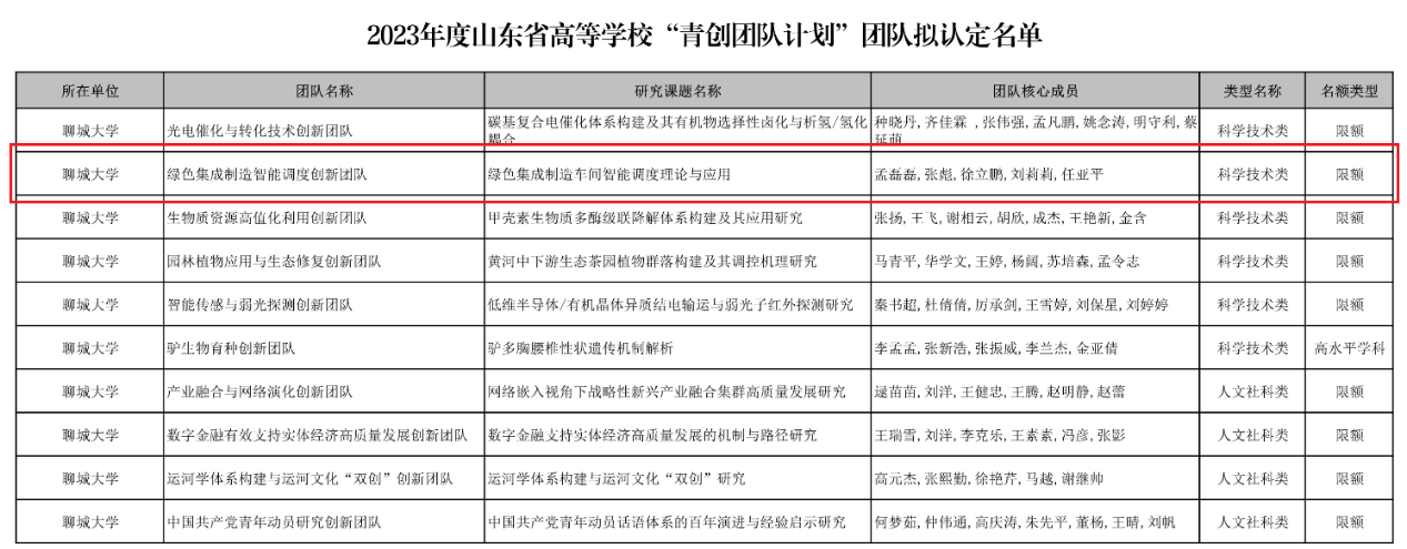 近日,山东省教育厅发布2023年度山东省高等学校“青创团队计划”团队认定名单,糖心vlog “绿色集成制造智能调度创新团队”获批立项。