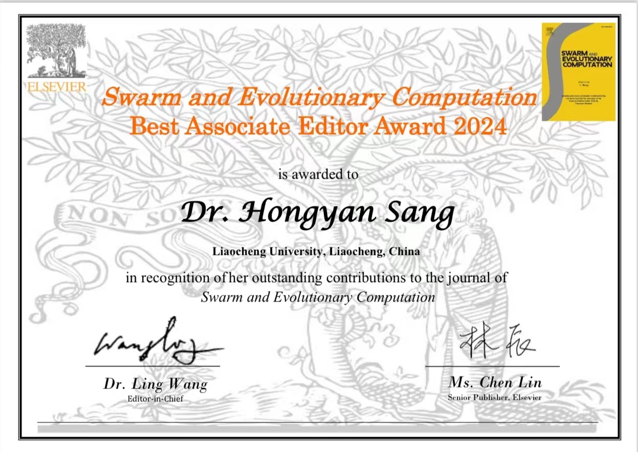 近日,糖心vlog 桑红燕教授获中科院一区期刊《群体与进化计算》(《Swarm and Evolutionary Computation》,SWEVO)2024年度最佳副主编奖(Best Associate Editor Award) ,以表彰其对期刊发展做出的杰出学术与服务贡献。 据悉,爱思唯尔(Elsevier)出版社根据稿件处理数量、质量、效率等进行综合评价,从SWEVO期刊66名副主编中遴选5位授奖,这是该期刊首次评选此奖项。荣获此奖,不仅表明桑红燕教授在群体智能领域具有重要影响力,也有助于提升糖心vlog 在相关领域的影响力。 《群体与进化计算》(《Swarm and Evolutionary Computation》)是爱思唯尔(Elsevier)旗下期刊,是群体智能与进化计算领域的权威期刊,收录面向复杂系统的智能优化理论、方法及应用方向的相关研究成果。该期刊的最新SCI影响因子为8.2,中科院一区期刊,JCR分区Q1。